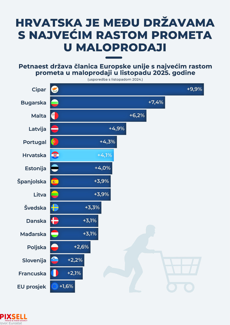 Infografika prikazuje petnaest država članica Europske unije s najvećim rastom prometa u maloprodaji u listopadu 2025. godine. Uspoređujući s istim mjesecom 2024. godine, na Cipru je promet u maloprodaji porastao 9,9%, Bugarskoj 7,4% i Malti 6,2%. Prosjek Europske unije je 1,6 posto, što je Hrvatska uvelike nadmašila s 4,1%.