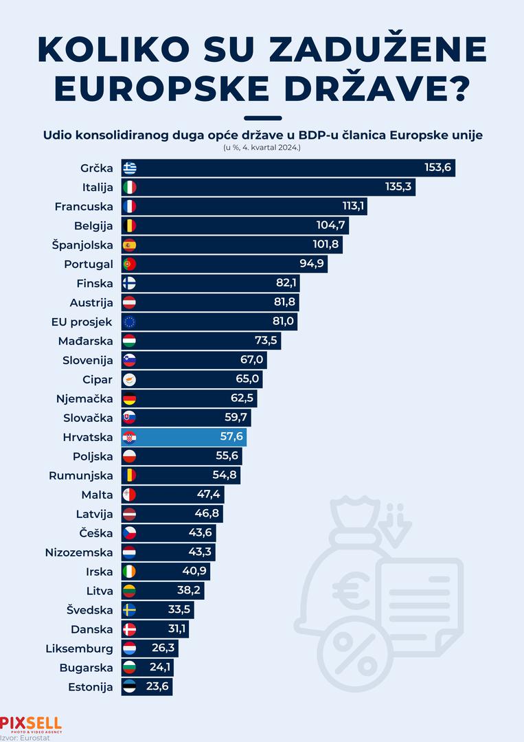 Grčka prednjači s daleko najvećim udjelom duga, koji iznosi 153,6% BDP-a, dok se odmah iza nje nalazi Italija sa 135,3%. Slijede Francuska (113,1%), Belgija (104,7%) i Španjolska (101,8%).