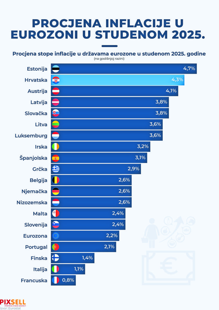 Prema najnovijim procjenama Eurostata, prosječna stopa inflacije u eurozoni u studenome 2025. godine iznosi 2,2 posto, što je za 0,1% više nego prethodnog mjeseca. Na prvom mjestu nalazi se Estonija s inflacijom od 4,7 posto, slijedi Hrvatska s visokih 4,3 posto i Austrija s 4,1 posto. Latvija je od prošlog mjeseca s prvog mjesta pala na četvrto s 3,8 posto. Među zemljama s najnižom inflacijom izdvajaju se Finska s tek 1,4 posto, Italija s 1,1 posto i Francuska s 0,8 posto.