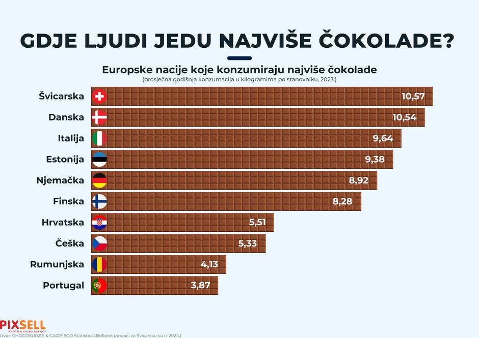 U vrhu su i Estonci (9,38 kg), Nijemci (8,92 kg) te Finci (8,28 kg), što potvrđuje da je čokolada posebno omiljena u sjevernim i zapadnim dijelovima Europe. Hrvatska se nalazi u sredini ljestvice – prosječan stanovnik godišnje pojede 5,51 kilogram čokolade, malo više od Čeha (5,33 kg).