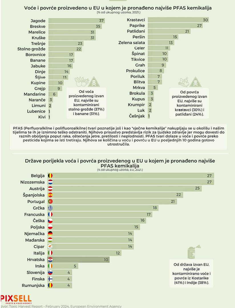 Njihova se količina u voću i povrću u Europskoj uniji u posljednjih 10 godina gotovo utrostručila. Najviše PFAS kemikalija, prema Pixsellovoj grafici, kada je riječ o voću, ima u jagodama, breskvama, marelicama, kruškama, trešnjama, stolnom grožđu, borovnicama, bananama, jabukama i dinjama. Kada je riječ o povrću koje ima najviše PFAS kemikalija, na vrhu ljestvice su krastavci, zatim paprike, patlidžani, peršin, zelena salata, celer, špinat, tikvice, grah i prokulice.
