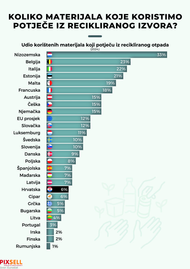Infografika prikazuje udio korištenih materijala koji potječu iz recikliranog otpada. U Nizozemskoj taj udio iznosi 33 posto, u Belgiji 23 posto i u Italiji 22 posto. Najmanji udio korištenih materijala koji potječu iz recikliranog izvora imaju Irska (2%), Finska (2%) i Rumunjska (1%). Hrvatska se nalazi pri dnu ljestvice sa 6% materijala iz recikliranog otpada.