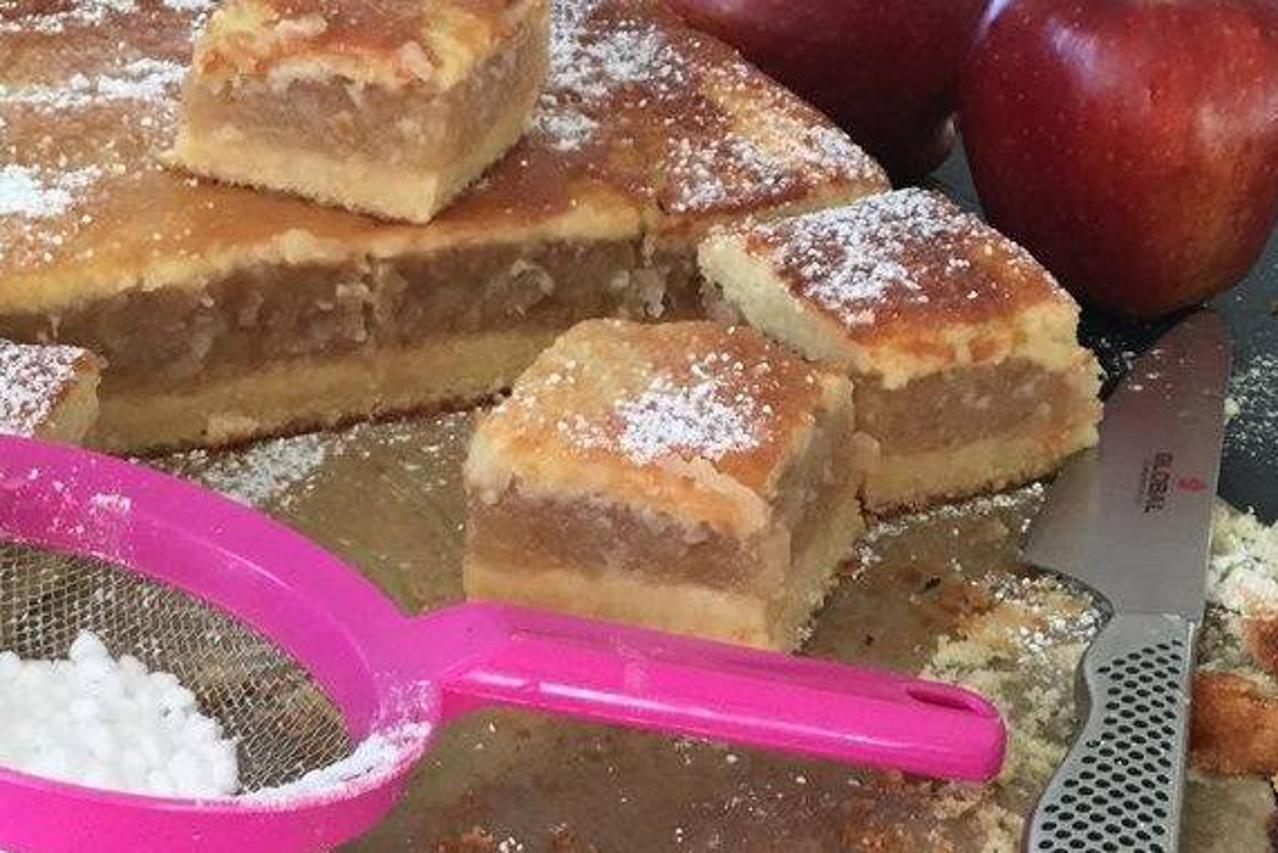 Dodati cimet i vaniliju šećer, promješati i pažljivo sipati na tijesto. Preko jabuka sipati drugi dio tijesta i vratiti kolač u pećnicu. Peći do kraja. Provjeriti sa čačkalicom. Peći na 190 stupnjeva u prethodnoj zagrijanoj pećnici. Pečen i ohlađen kolač sijeći na kocke, a po želji posuti sa šećerom u prahu.