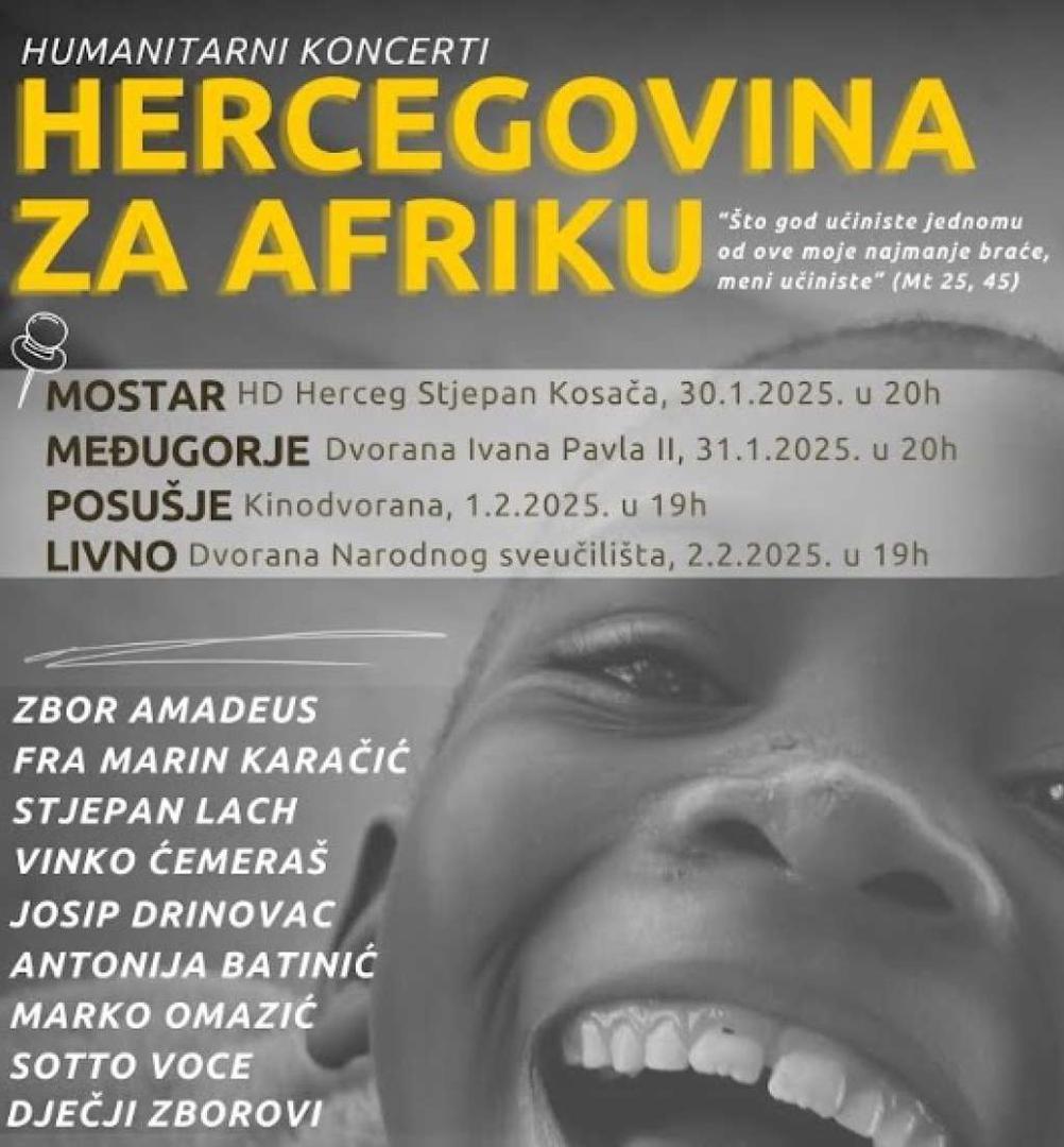 Koncert u Mostaru planiran je za 30. siječanj u Hrvatskom domu hercega Stjepana Kosače u 20 sati. U dvorani Ivana Pavla II. u Međugorju 31. siječnja u 20 sati će se održati drugi koncert, dok će se dan poslije u Posušju u kinodvorani u 19 sati održati treći koncert. Livno će biti domaćin četvrtog koncerta 2. veljače u dvorani Narodnog Sveučilišta s početkom u 19 sati. Ideju je svesrdno podržao mostarski zbor 'Amadeus' na čelu sa Emilom Bevandom koji je već godinama prepoznatljiv po uspješnim humanitarnim projektima u kojima sudjeluju i organiziraju. Niti ovaj projekt za djecu Afrike neće biti izuzetak.