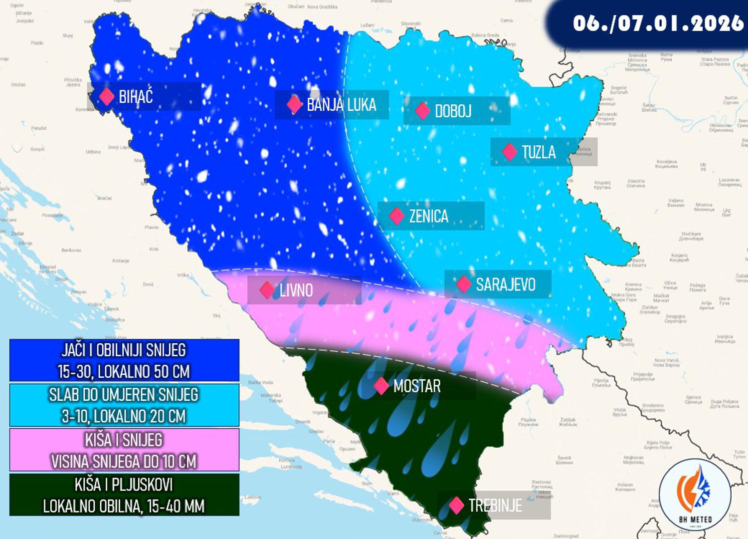Snježnih padalina će biti i tijekom srijede, ali ništa obilno. U večernjim satima srijede dolaskom još hladnijeg zraka, snježne padaline su moguće i u južnijim dijelovima Hercegovine.
