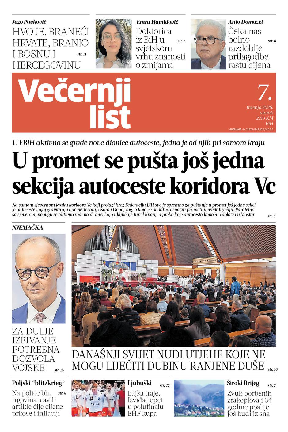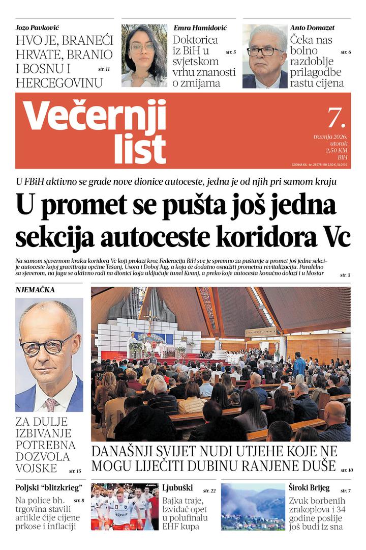 Tiskano izdanje Večernjeg lista BiH i ovog utorka, 7. travnja 2026. godine, donosi brojne analize, aktualnosti, intervjue... iz zemlje, regije i svijeta. Tu su političke, socijalne, gospodarske, sportske... teme.