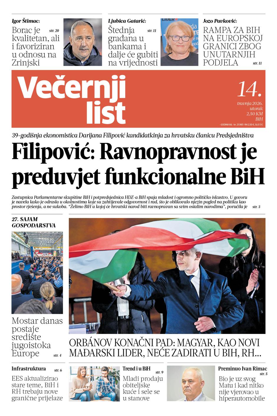 Tiskano izdanje Večernjeg lista BiH i ovog utorka, 14. travnja 2026. godine, donosi aktualne teme iz zemlje, regije i svijeta, uz analize, intervjue, vijesti iz kulture, sporta, showbiza...