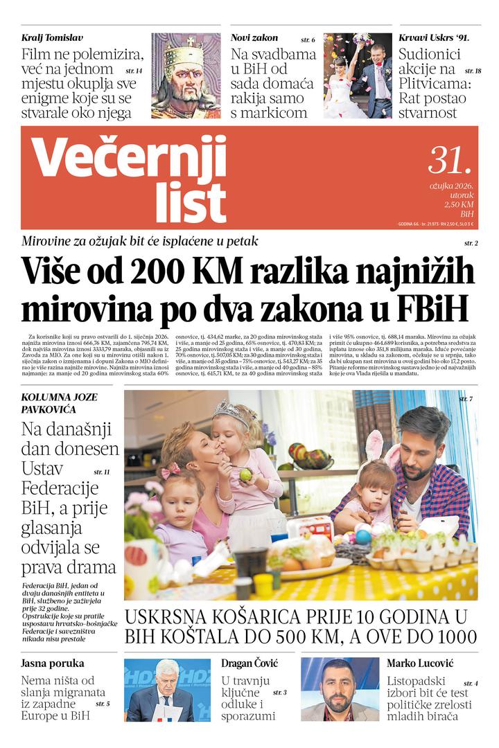 Ne propustite Večernji list BiH u utorak: Isplata mirovina, koliko košta uskrsna košarica, sjećanje na "krvavi Uskrs"...