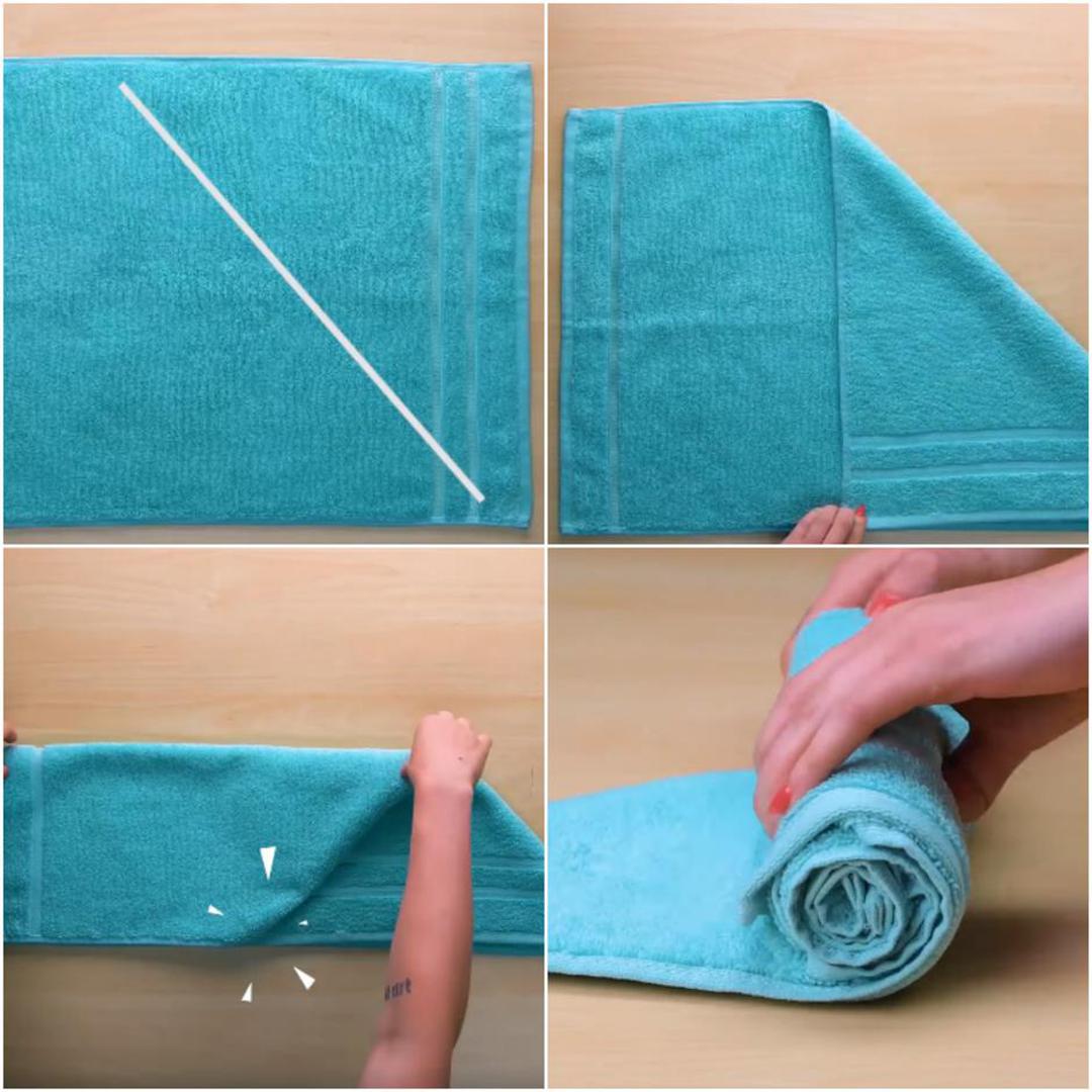 Druga stvar koju je pokazala je slaganje ručnika za lice: povucite desni gornji ugao prema dolje čineći trokut, a zatim lijevi gornji ugao ravno prema dolje da dobijete pravokutnik. Počnite rolati s lijevog kraja i vrh trokuta zakačite u unutrašnjost.