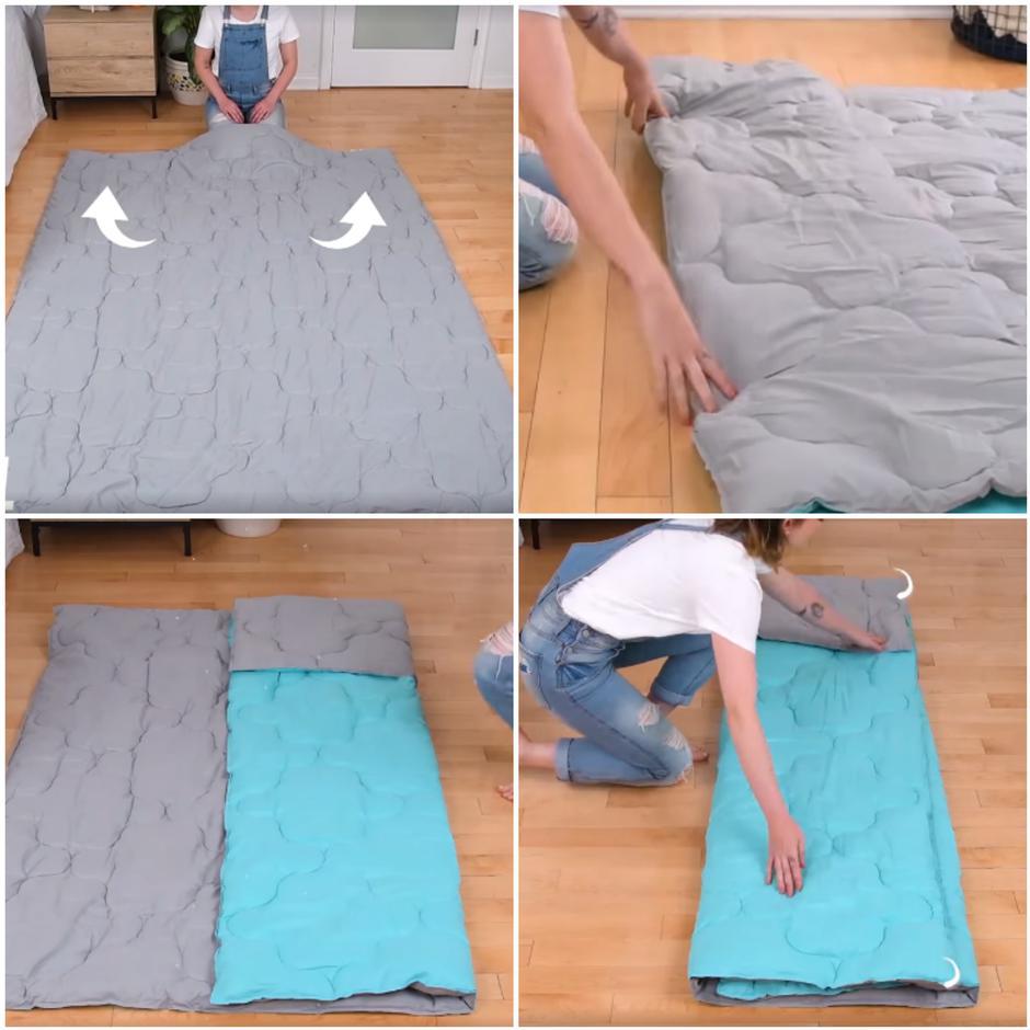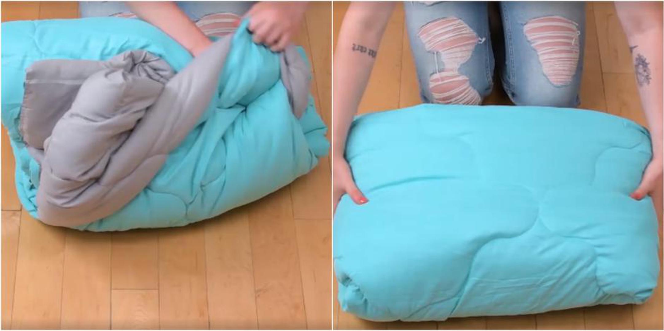 Kada je riječ o prekrivaču, tehnika je takva da jedan kraj 'spremite' u drugi. Prekrivač stavite na ravnu podlogu i počnite s vrhom koji ćete presavinuti na donju stranu. Presavinite onda desnu, pa lijevu stranu. Donji kraj počnite slagati prema vrhu od kojeg ste dobili 'mali pretinac' u koji možete 'pospremiti' prekrivač.