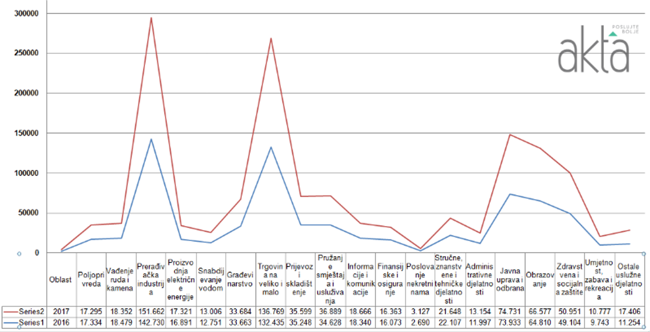 Najviše zaposlenih u BiH je, kako pokazuje statistika, u prerađivačkoj industriji i trgovini na veliko i malo i  ove oblasti su u 2017. imale značajan porast zapošljavanja, piše Akta.ba.