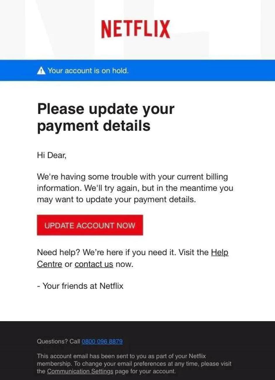 Netflix je savjetovao svoje korisnike da budu oprezni zbog prevare koja se širi u posljednje vrijeme. Tijekom vikenda mnogi korisnici su primili mail s naslovom "Molim vas urediti vaše podatke o plaćanju", izvještava The Mirror. Poruka djeluje poput redovitog automatskog Netflixovog odgovora, kada postoji problem s računom koji je zaključan zbog problema s plaćanjem.