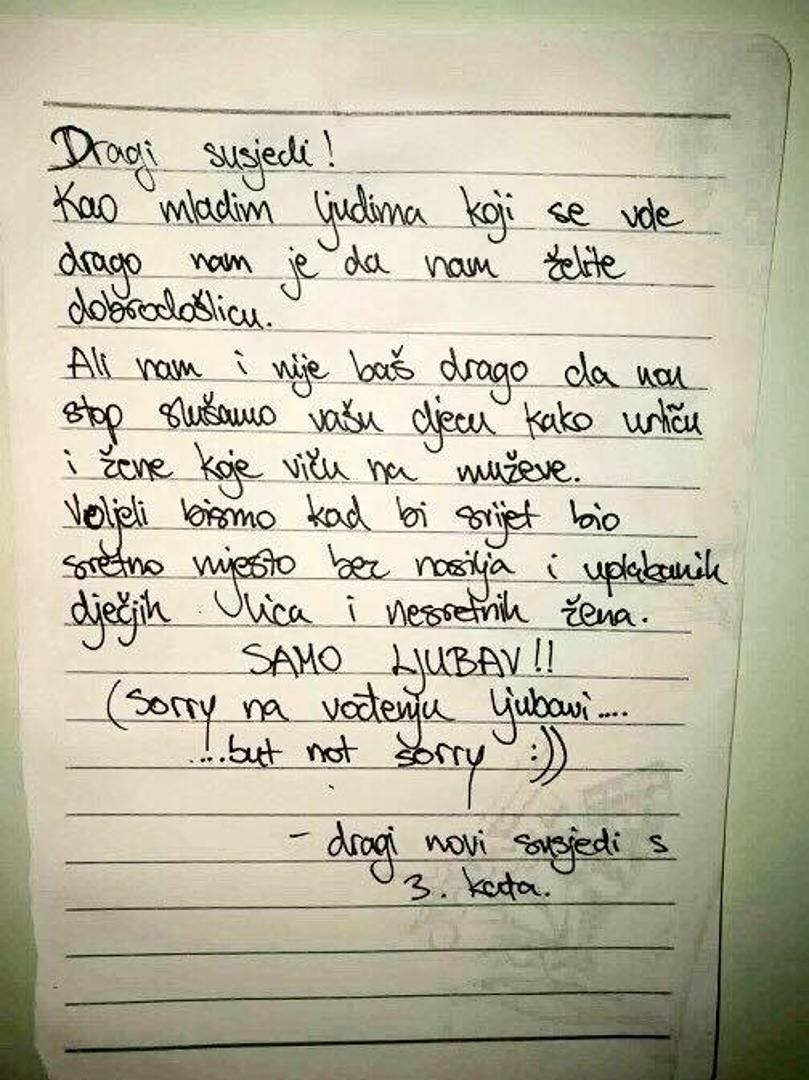 U pismu objavljenom na Facebook stranici ''Dnevna doza prosječnog Dalmatinca'' stoji kako im je drago da se mladi ljudi vole, no nije im baš ugodno slušati te urlike. Nije prošlo puno vremena i susjedi su dobili odgovor. ''Mladi ljudi'' prozvani u prvom pismu sada odgovaraju kako njima nije baš drago slušati njihovu djecu kako urliču i žene koje viču na muževe. "Voljeli bismo kada bi svijet bio sretno mjesto bez nasilja i uplakanih dječjih lica i nesretnih žena. Samo ljubav", stoji u odgovoru.