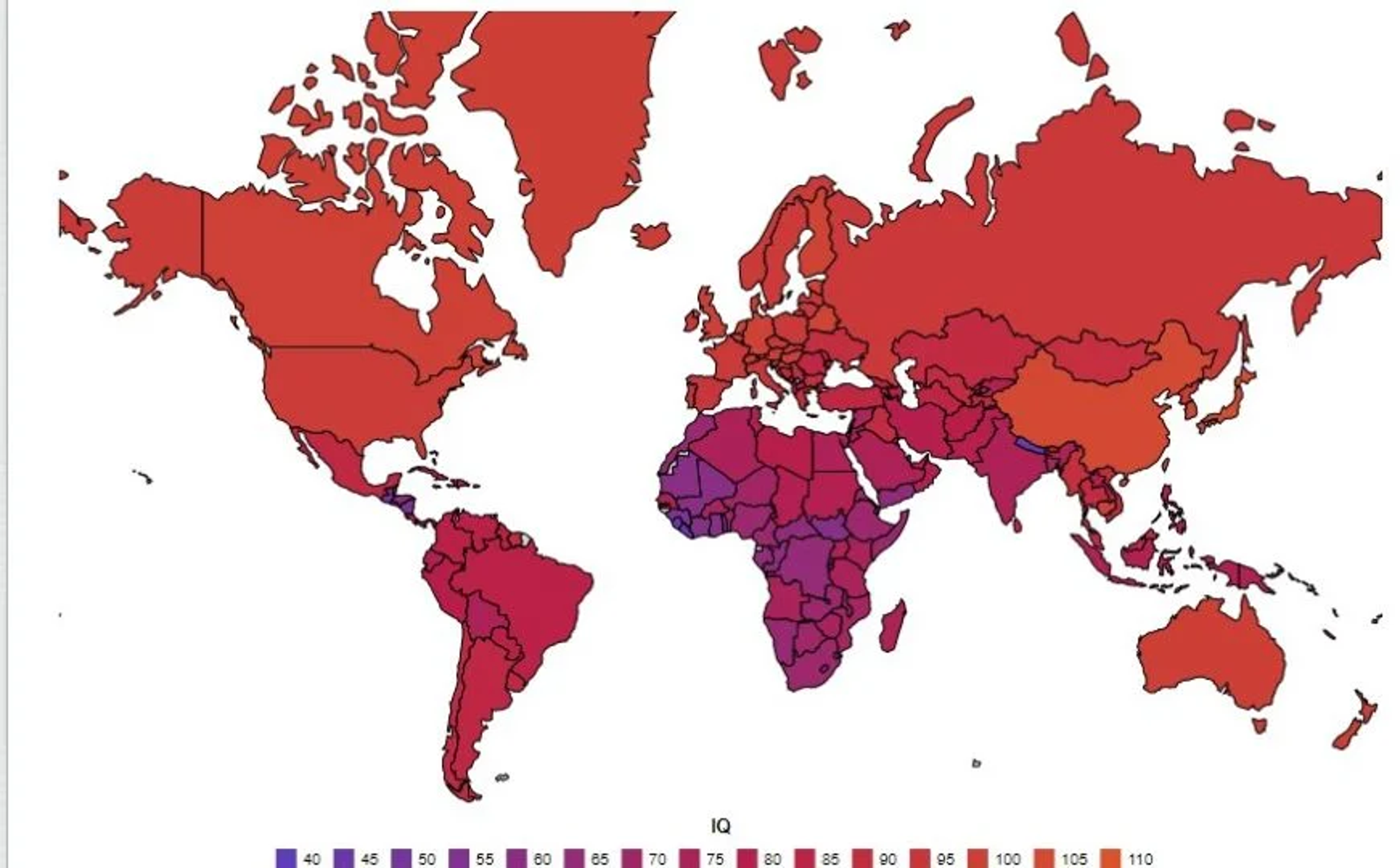 Nasuprot tome, zemlje s višim prosječnim IQ rezultatom izgledaju crveno-narančasto.