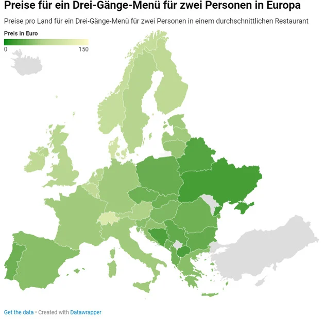 "Dok u Europi najviše novca potrošite na pivo u Norveškoj u Švicarskoj ćete najskuplje platiti obrok od tri slijeda. Također u top 10 najskupljih zemalja su Danska, Irska, Belgija, Švedska, Ujedinjeno Kraljevstvo i Finska, gotovo cijela sjeverozapadna Europa", navode. Ako tražite zemlje s ekonomičnijim cijenama obroka, jasno je da ćete ih pronaći u istočnom dijelu Europe te na Balkanu. Njihovo istraživanje otkrilo je da je najjeftinija Ukrajina, gdje prosječna cijena obroka u tri slijeda iznosi 22,77 eura. No, budući da je u ovoj zemlji rat, izdvojili su Sjevernu Makedoniju, gdje prosječni obrok iznosi nešto više od 24 eura.
