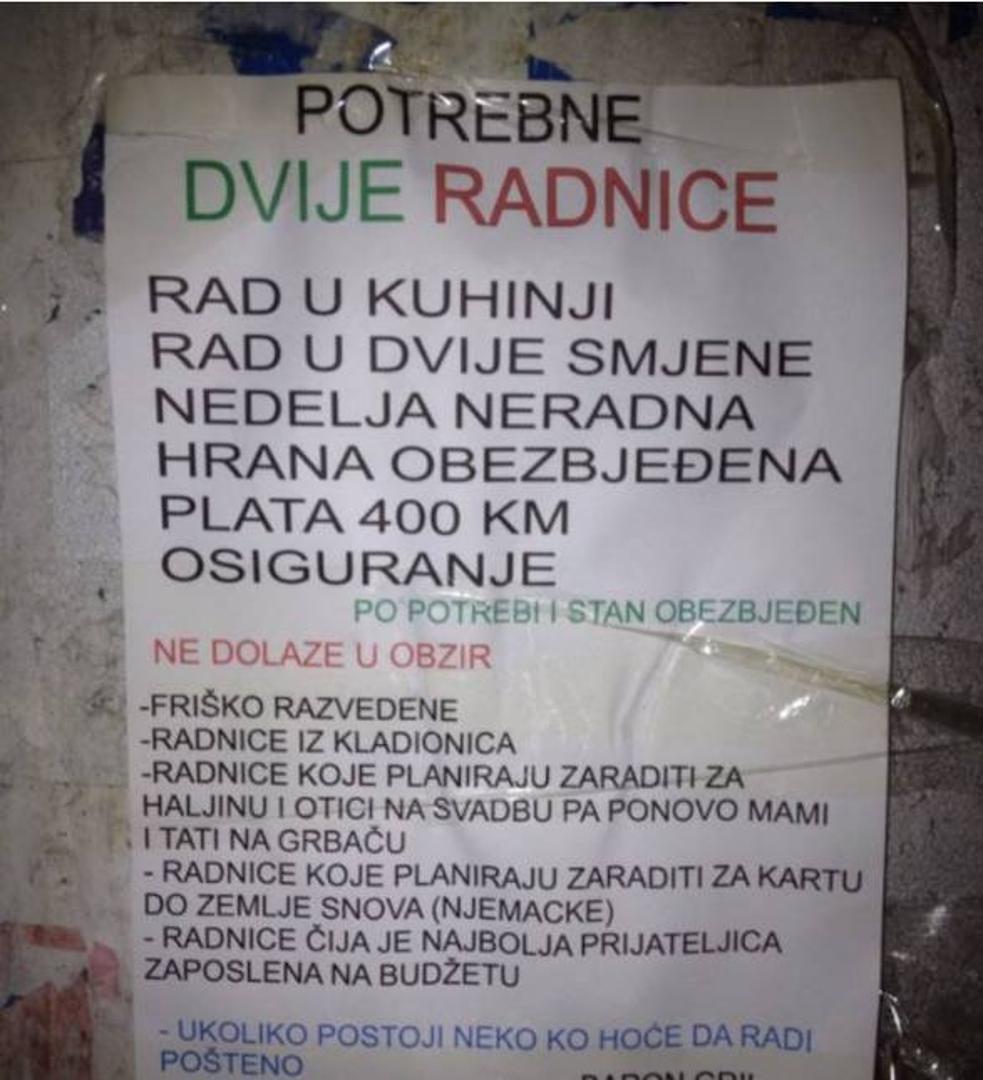 Zbog zanimljivih uvjeta rada, oglas objavljen u Brčkom u BiH brzo se proširio društvenim mrežama. Riječ je, naime, o plakatu u Brčkom za posao radnica u kuhinji.
