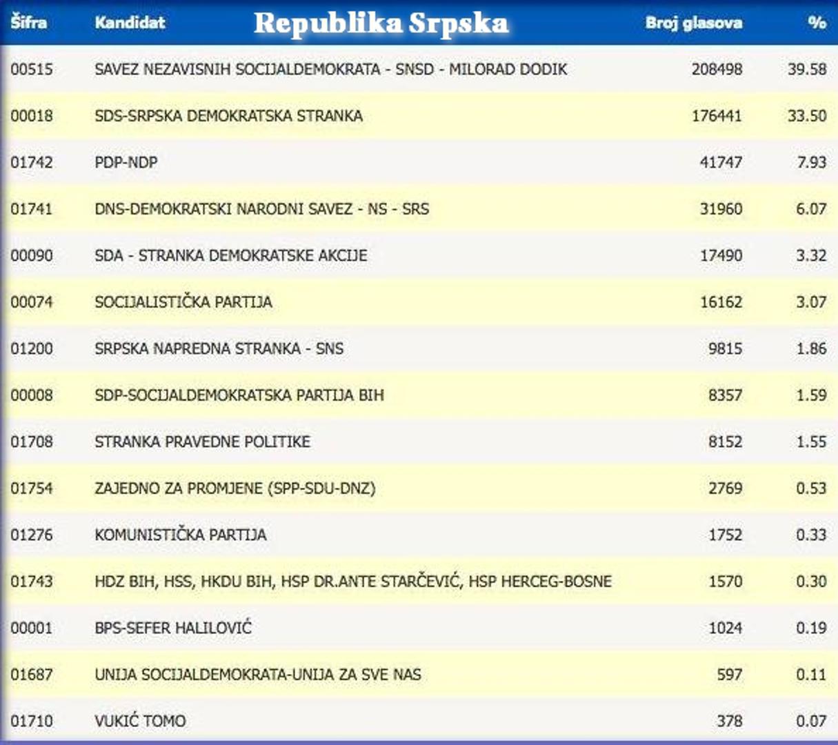 03.00: Milorad Dodik, predsjednik SNSD-a, proglasio je noćas pobjedu Željke Cvijanović, kandidatkinje Koalicije SNSD-DNS-SP za srpskog člana Predsjedništva BiH. "Odlučili su glasovi u Banjoj Luci u kojoj je Željka Cvijanović dobila 60.960, a njen protukandidat 52.175 glasova", rekao je Dodik i dodao da je na razini RS-a za Cvijanovićevu glasao 309.201, a za Mladena Ivanića, kandidata Saveza za promjene, 303.621 birač. Dodik smatra da ova razlika ne može biti dostignuta, napomenuvši da se u zbirnom rezultatu nalaze i glasovi iz Bijeljine. Što se tiče trke za predsjednika RS-a, Dodik je objavio da je za njega glasalo oko 440.000 ljudi, a za Ognjena Tadića oko 12.500 glasača manje.