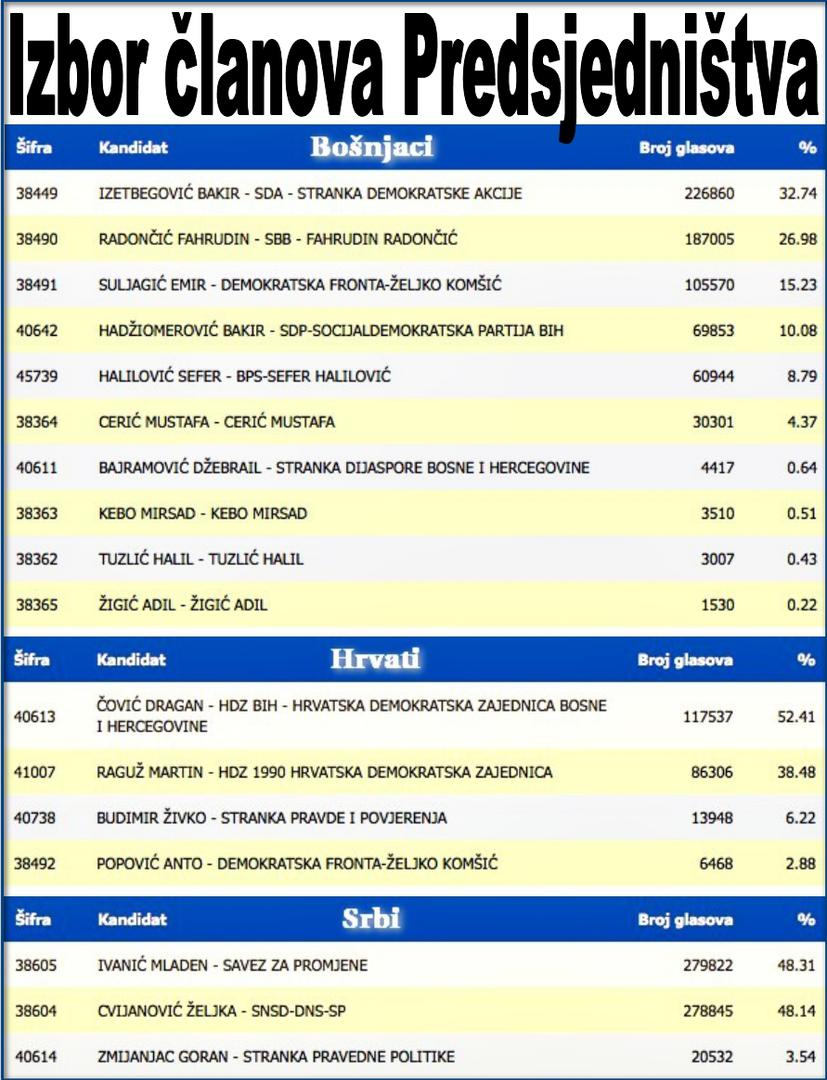 14.05: Prema podacima SIP-a, nakon 92,60 posto prebrojanih glasova, Dragan Čović izabran je za člana Predsjedništva ispred reda Hrvata sa 117.537 glasova, dok njegov najbliži pratitelj Martin Raguž ima 86.306 glasova. Kod Bošnjaka, novi/stari član Predsjedništva BiH je Bakir Izetbegović koji osvaja 226.860 glasova, a slijedi Fahrudin Radončić sa 187.005 glasova. Novi srpski član Predsjedništva trebao bi biti Mladen Ivanić koji dosad osvaja 279.822 glasa, a Željka Cvijanović prema ovom dobiva 278.845 glasova.
