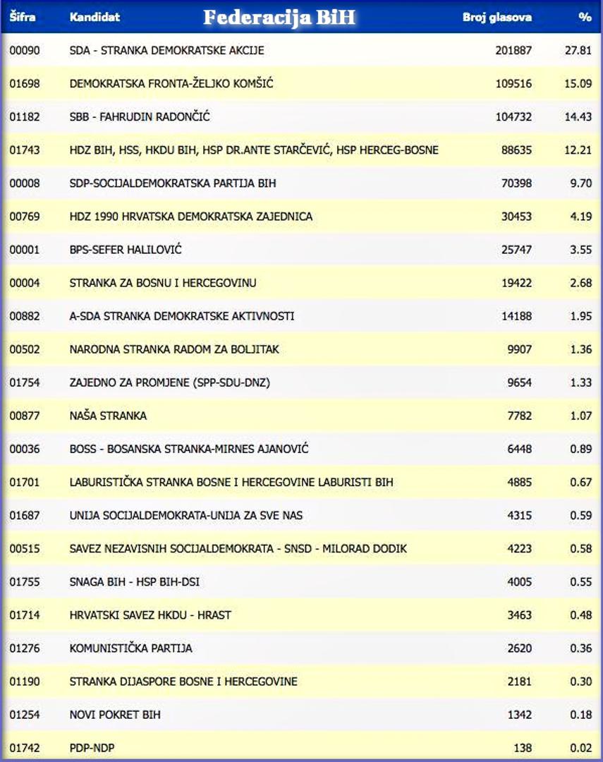 09.00: Od ukupno obrađenih 823.509 glasova, važećih je bilo 759.106 glasova. I na ovim izborima zabilježen je veliki broj nevažećih glasova, odnosno 64.403 za bošnjačkog i hrvatskog člana Predsjedništva BiH.