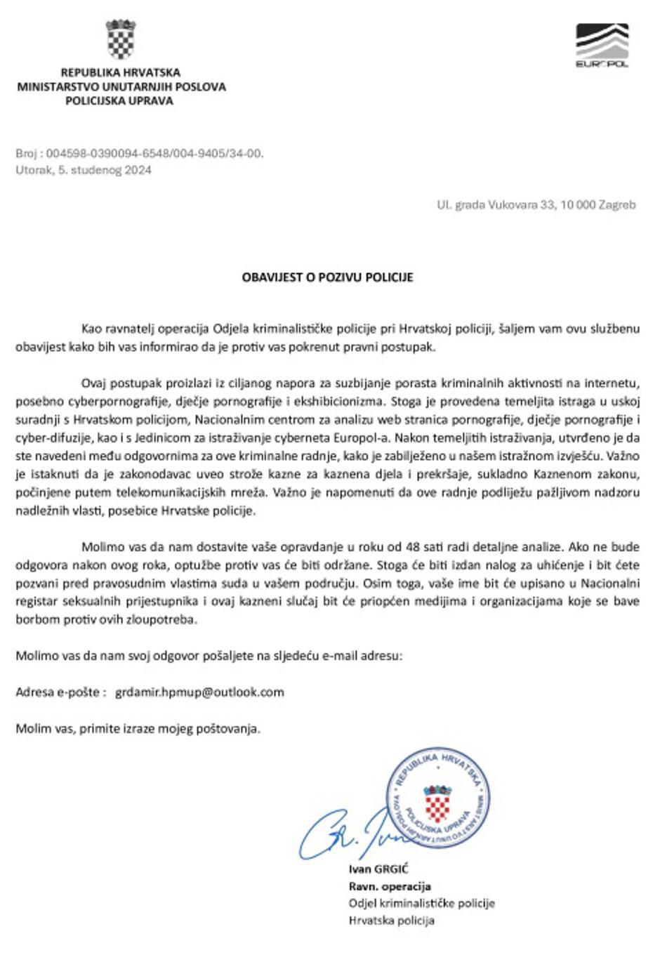 Potpisnik lažnog dopisa je navodni ravnatelj Odjela kriminalističke policije koji od primatelja traži da odgovori na poruku ili će uprotivnom biti uhićen i predan pravosudnim tijelima.
