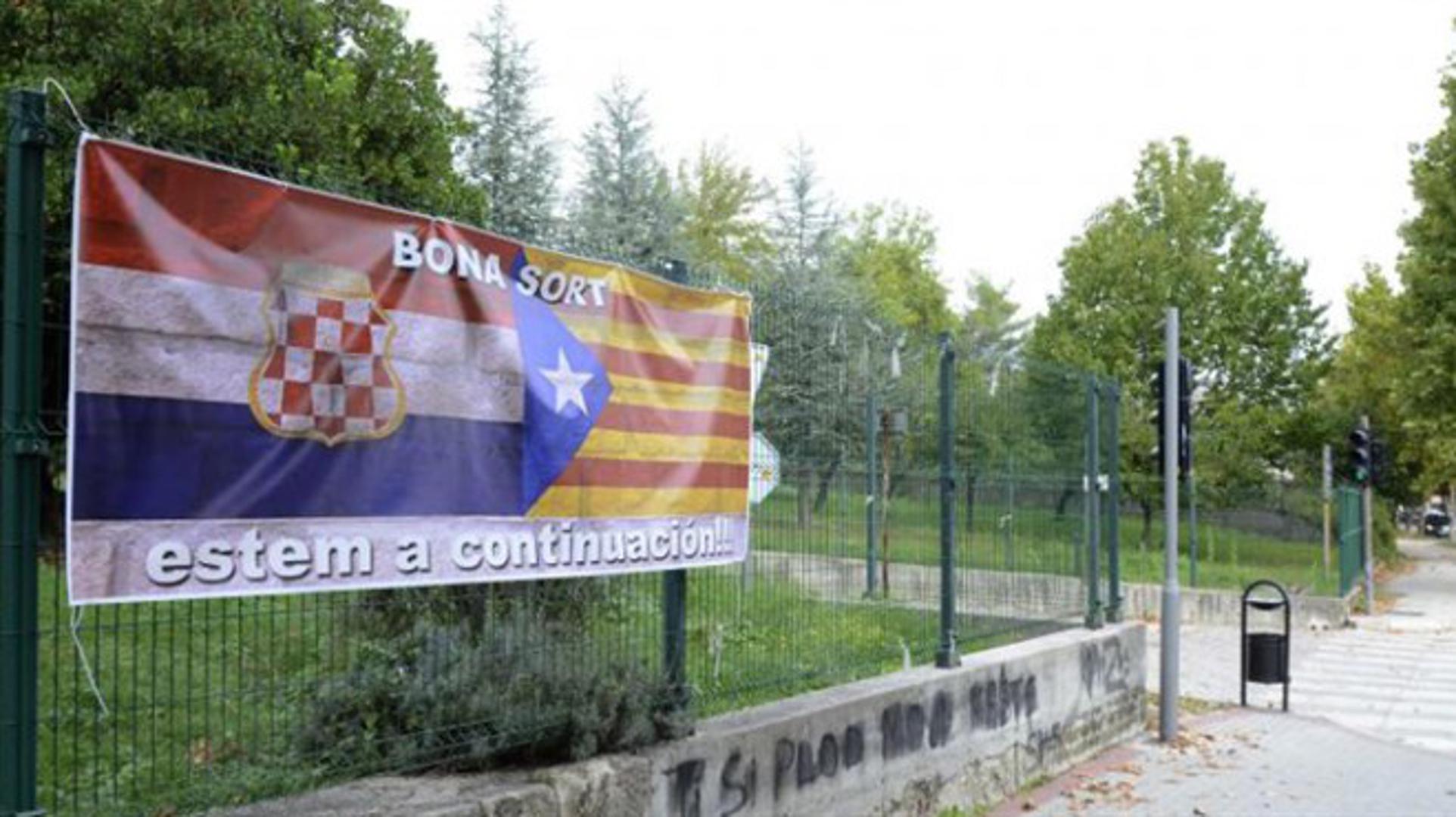 U Mostarskom naselju Balinovac, Ulici biskupa Čule preko puta katedrale jutros je osvanuo transparent s katalonskom i zastavom Herceg-Bosne s porukom "sretno, mi smo sljedeći"