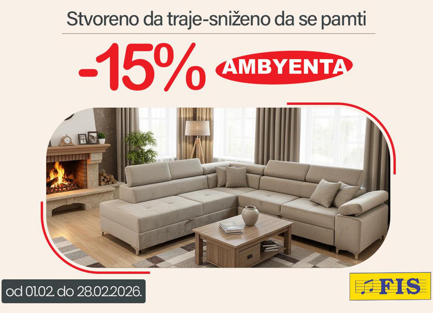 Od 1. do 28. veljače 2026. godine, FIS donosi 15% popusta na kompletan asortiman domaćeg namještaja Ambyenta. Ova posebna ponuda dostupna je u svim FIS prodajnim centrima, kao i na FIS web-shopu.