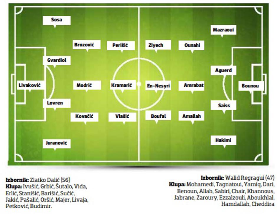 Obje će reprezentacije istrčati u sustavu 4-3-3, iako je Regragui u jedinoj pripremnoj utakmici u studenom pokušao ubaciti sumnje u oči i uši suparnika kad je izveo svoju momčad u 3-4-3 formaciji, ma da je cijela marokanska javnost svjesna da je taj potez bio samo pokušaj da suparnici "zaborave" na klasični marokanski sistem. Što se tiče kadra, i tu je u Maroku sve više-manje jasno. Nakon što je jedan od najboljih igrača Maroka, ofenzivni veznjak Marseillea Amine Harit otpao s Mundijala zbog ozljede, njega je zamijenio Selim Amallahi koji je u vrhunskoj formi u belgijskom Standardu. Glavna snaga marokanske vrste su bekovi, a mnogi tvrde da imaju i najjači par bekova na cijelom SP-u; Achrafa Hakimija iz PSG-a te Noussaira Mazraouija iz Bayerna. Cijela momčad je protkana igračima iz najjačih europskih liga, pa su tu recimo i sjajni vratar Seville Bounou, njegov suigrač u Sevilli, napadač El-Nesyri, stoper West Hama Aguerd. Što se načina igre tiče, bez obzira na istu formaciju, Hrvatska i Maroko igraju dijametralno suprotan nogomet. Dok Hrvatska igra s visokim presingom i temelji svoju igru na posjedu, Maroko svoju igru temelji na niskom bloku i kontranapadima.