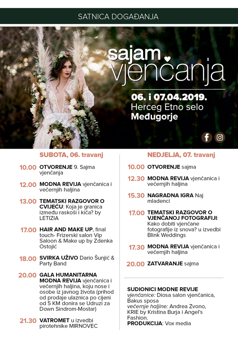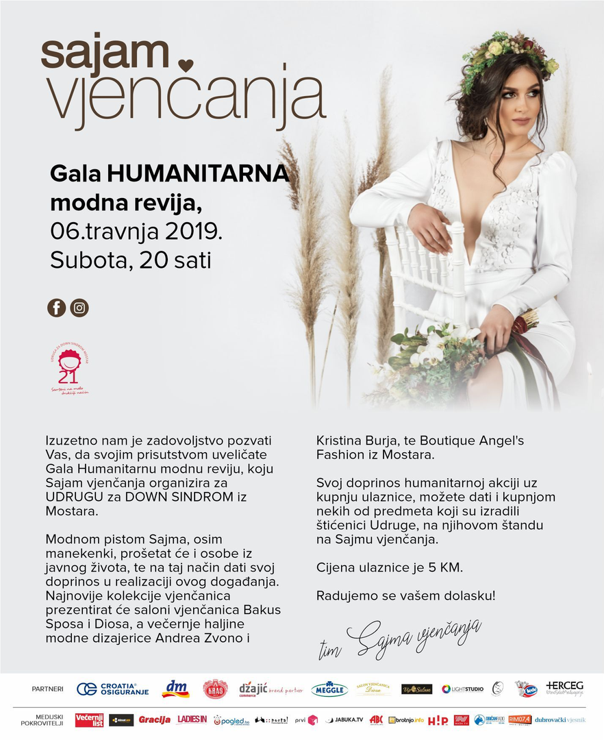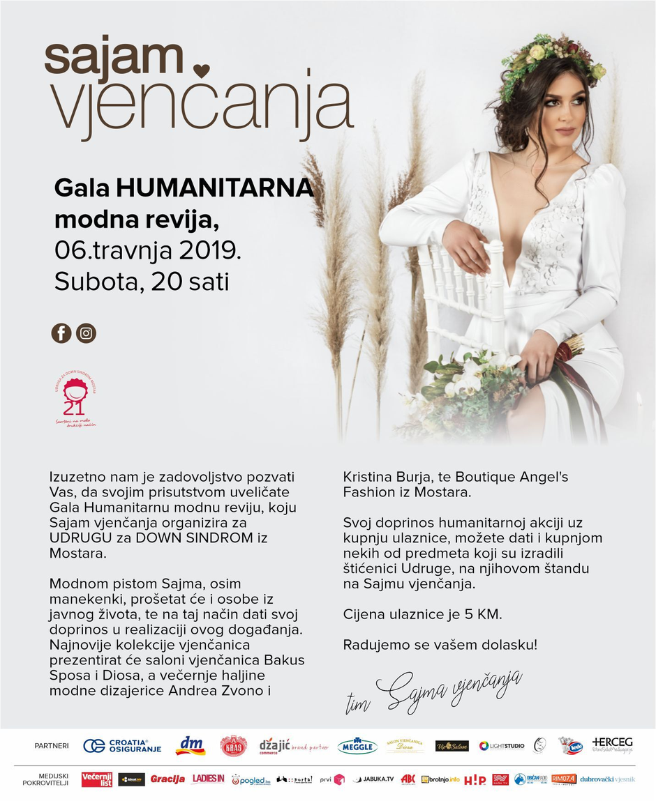 Gala humanitarnu modnu reviju 9. Sajma vjenčanja nositi će osobe iz javnog života, među kojima su Ivo Amulić, Maja Blagdan, Žanamari Lalić, Vedran Mlikota i Adrijana Kurtišaj koji će na taj način potpomoći radu Udruge i senzibilizaciji javnosti prema osobama s Down sindromom. Prihod od prodaje ulaznica, po cijeni od 5 KM, organizator će donirat Udruzi!