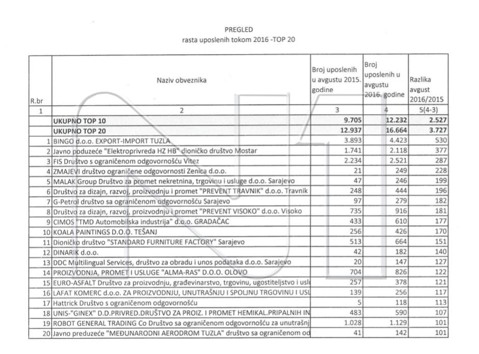 Novalić je sinoć u Pressingu, pak, prvi put javno otkrio zanimljive podatke kojima njegova Vlada raspolaže. Otkrio je i imena tvrtki koje su u Federaciji BiH tijekom 2016. imale najveći porast broja zaposlenih.
