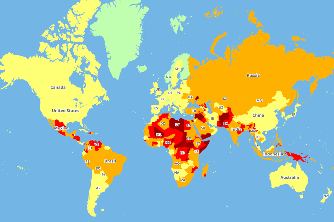 Zemlje koje su označene tamnocrvenom bojom su najlošije ocijenjene, dok su one ocijenjene svijetlozelenom najsigurnije.