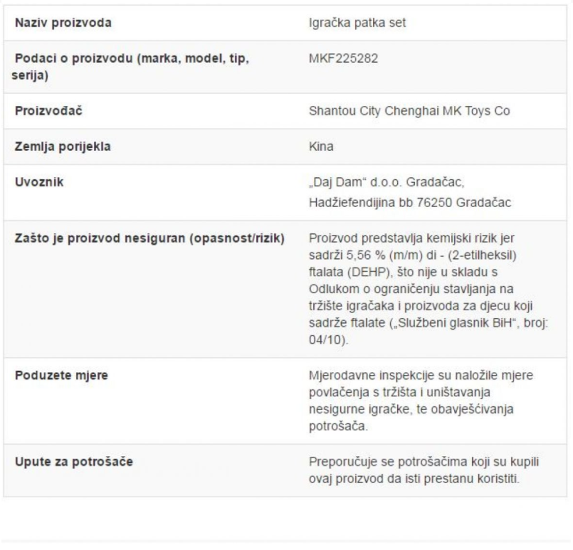 Riječ je o dječijoj igrački patka set čiji proizvod predstavlja kemijski rizik, jer sadrži 5,56 posto (m/m) di - (2-etilheksil) ftalata (DEHP), što nije u skladu s Odlukom o ograničenju stavljanja na tržište igračaka i proizvoda za djecu koji sadrže ftalate.