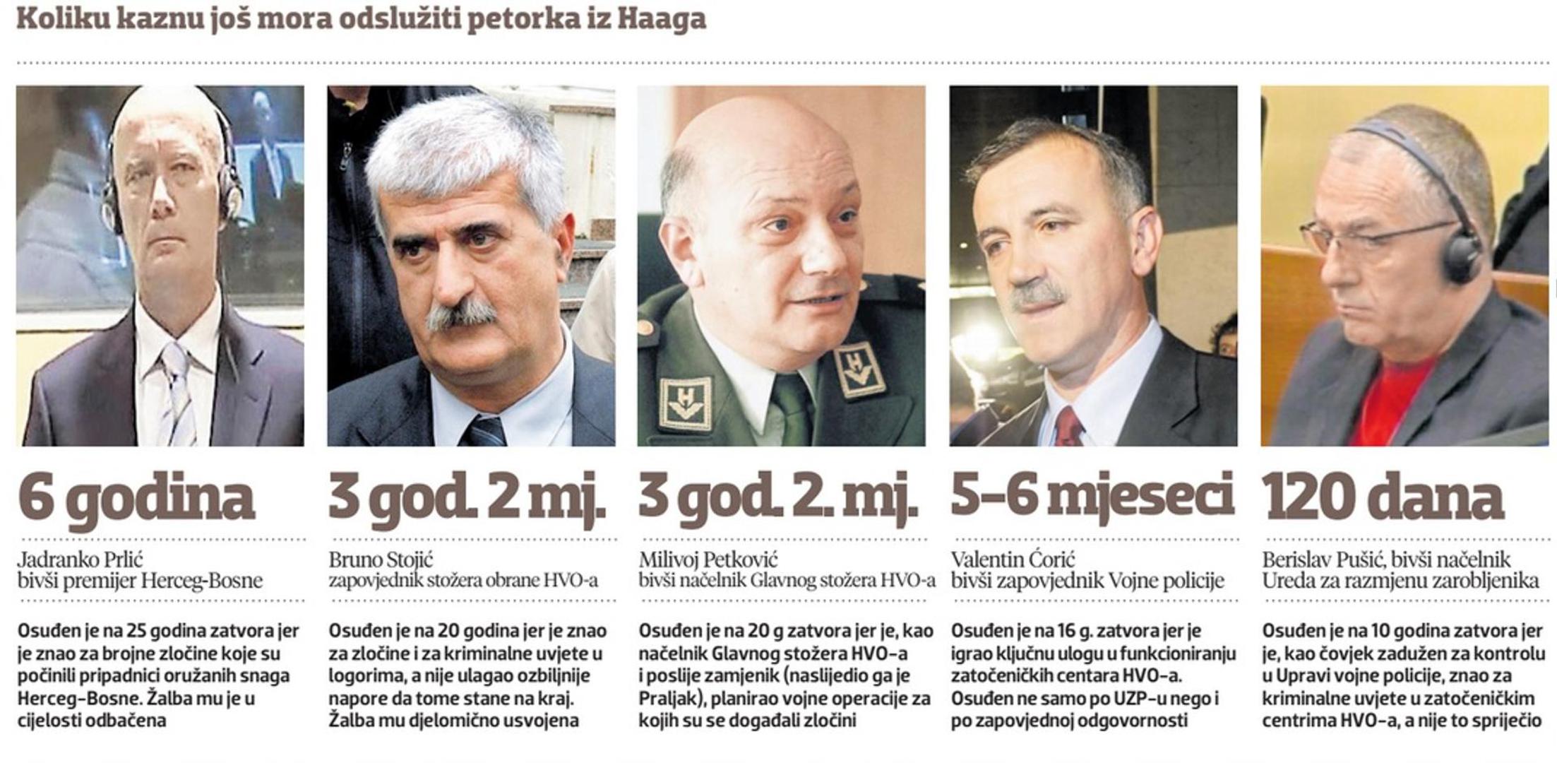Prema neslužbenim procjenama, koje smo čuli od upućenih izvora, ali koje nisu sasvim precizne, već samo upućena nagađanja (sasvim precizan izračun može dati samo Tribunal, koji to ne daje), do trenutka kad će odslužiti dvije trećine zatvorske kazne osuđenici imaju otprilike još ovoliko: Prlić nešto više od šest godina, Stojić i Petković oko 3 godine i 2 mjeseca, Ćorić 5-6 mjeseci, Pušić oko 120 dana. Haaški sud ima praksu da, u slučaju dobrog vladanja, pušta pravomoćno osuđene ratne zločince na slobodu nakon izdržavanja dvije trećine kazne. U žalbenom postupku Stojić, Petković, Ćorić i Pušić pokušali su promijeniti odluku prema kojoj im se u dosad odsluženo ne računa vrijeme provedeno na liječenju u Hrvatskoj ili u kućnom pritvoru na privremenoj slobodi (prije izricanja nepravomoćne presude svi su bili neko vrijeme čekali presudu na privremenoj slobodi, s koje je sud odlučio vratiti jedino Praljka, pa je stoga Praljak imao najviše odsluženih dana u pritvoru). No, Žalbeno vijeće nije im udovoljilo: kućni pritvor u Zagrebu nije, kažu, isto što i pravi pritvor u Scheveningenu.