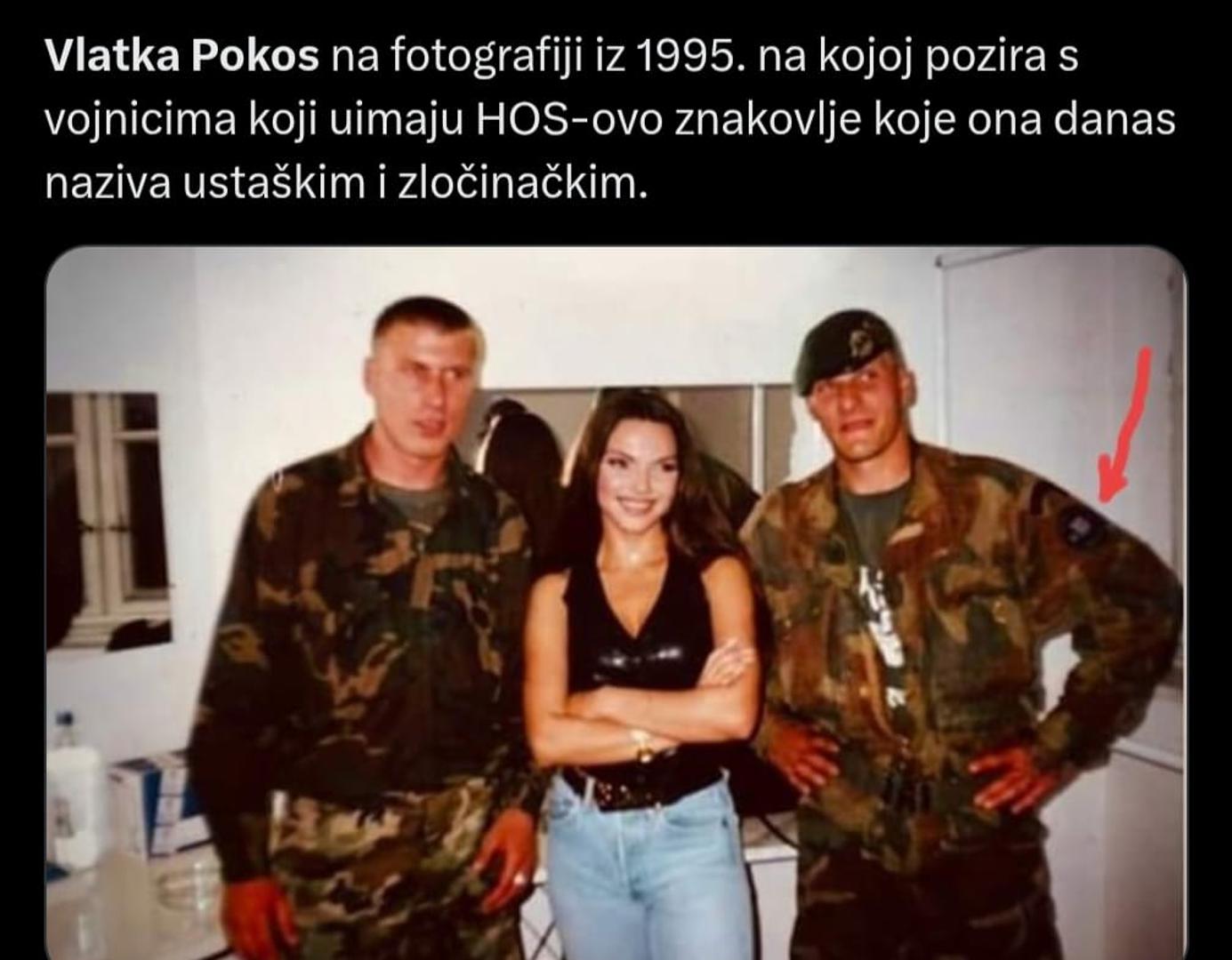 No, nije Vlatka oduvijek bila antifa ili protuhercegovački raspoložena. O tome svjedoči i fotografija na kojoj je rado pozirala s dvojicom bojovnika, od kojih je jedan nosio „mrsku“ oznaku HOS-a s natpisom #ZaDomSpremni.