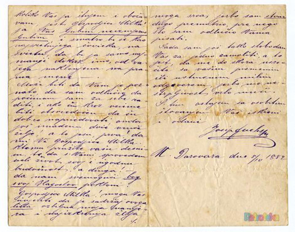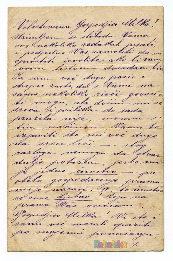 Uzimljem si slobodu Vama ovo nekoliko redakah pisati, i proljedno Vas zamoliti da mi oprostiti izvolite, ako bi vam ovim listom dosadan bio. Ja sam već dugo pazio i strepio, da s Vama na samo nekoliko rieči govoriti mogu, ali dočim mi se sreća i prilika do sada pružila nije, moram s tim načinom , Vama to izjaviti što mi već dugo na srcu leži, ______. S tog razloga nemogu da stvar dulje potežem, jerbo mi je jedno čuvstvo ______. Preotelo gospodarenje prama moje naravi. A to čuvstvo se zove LJUBAV! Koju na prama Vas osiećam. Gospodjice Milka! Vi ste i sami već morali upaziti po mojemu ponašanju, koliko Vas ja štujem i obožavam, jest gospodjice Milka! Ja Vas ljubim neizmjerno ljubim, i smatro bi se kao najsretnijega čovieka, na svietu, da bi ja samo najmanji dokaz imo…