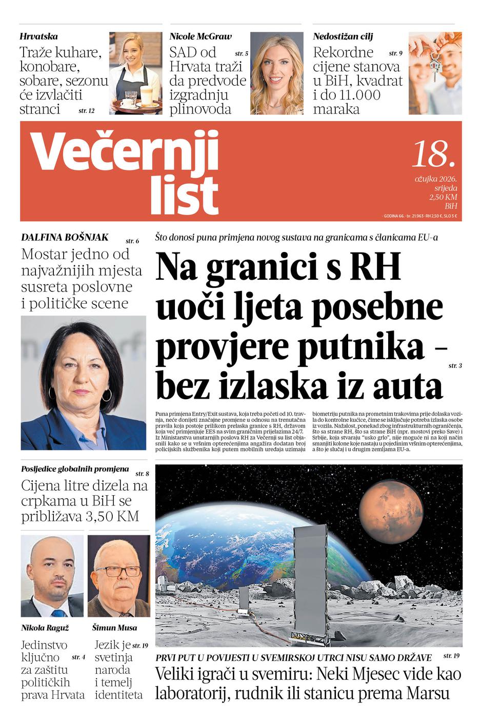 Novo tiskano izdanje Večernjeg lista BiH, 18. ožujka 2026. godine, donosi teme koje utječu na svakodnevni život građana — od cijena goriva, provjeri putnika na granici, djelovanju hrvatskih političkih stranaka pa do Mostarskog sajma, proljetnog umora i zanimljivih sportskih priča.