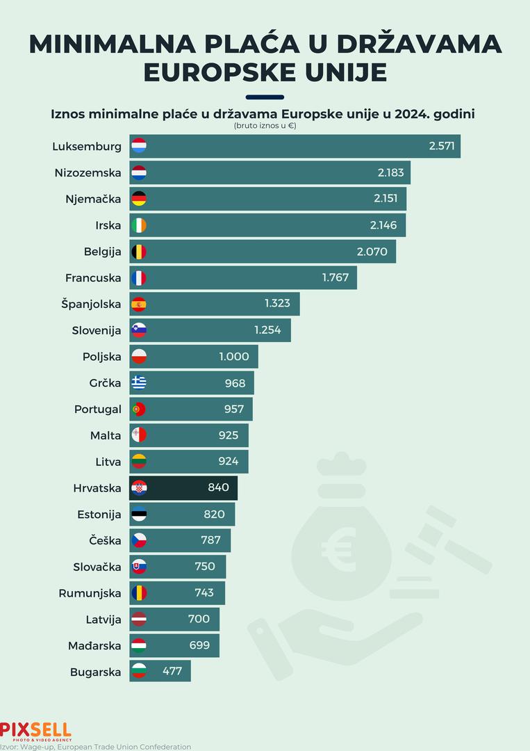 Minimalne plaće u zemljama Europske unije uvelike variraju. U bruto vrijednosti trenutačno se kreću od 477 eura u Bugarskoj do 2571 euro mjesečno u Luksemburgu. Minimalna plaća je veća od 2000 eura u Luksemburgu, Irskoj, Nizozemskoj i Njemačkoj, dok u Francuskoj iznosi 1767, a u Španjolskoj 1323 eura. U Hrvatskoj je minimalna plaća 840 eura, piše Večernji list BiH. Na dnu liste, osim Bugarske, našla se Mađarska sa 699 eura, Latvija sa 700, Rumunjska sa 743, kao i Češka sa 787 eura. Budući da je riječ o bruto izračunima, a svaka zemlja ima svoja pravila kada su u pitanju doprinosi i fiskalna politika, iznosi koje radnici u spomenutim država dobiju na ruke značajno su niži od navedenih. Kada je riječ o Bosni i Hercegovini, minimalna bruto plaća kretala bi se oko 565 eura. Naime, odlukom Vlade Federacije BiH najniža plaća u Federaciji BiH za razdoblje od 1. siječnja do 31. prosinca 2024. godine utvrđena je u neto iznosu od 619 KM. Kako su tom prilikom naveli iz Vlade Federacije BiH, najniža plaća u Federaciji BiH (od 1. siječnja 2024.) propisana je u fiksnom mjesečnom iznosu, što znači da se ona i isplaćuje za svaki mjesec u istom iznosu, bez obzira na ukupan broj radnih dana odnosno radnih sati u pojedinom mjesecu. Najniža plaća u Republici Srpskoj (od 1. siječnja 2024.) također je propisana u fiksnom mjesečnom iznosu, što također znači da se i ona isplaćuje za svaki mjesec u istom iznosu, bez obzira na ukupan broj radnih dana odnosno radnih sati u pojedinom mjesecu. Najniži iznos plaće u ovom bh. entitetu od početka ove godine je 900 KM (neto poslije oporezivanja), i to u skladu s odlukom o najnižoj plaći za 2024. godinu. Kada je riječ o obračunu plaća, jedinstvena stopa poreza na dohodak od 10% vrijedi u oba entiteta, piše Večernji list BiH.