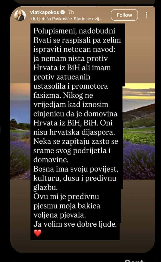 Nikog ne vrijeđam kad iznosim činjenicu da je domovina Hrvata iz BiH – BiH. Oni nisu hrvatska dijaspora. Neka se zapitaju zašto se srame svog podrijetla i domovine. Bosna ima svoju povijest, kulturu, dušu i predivnu glazbu, napisala je Pokos.