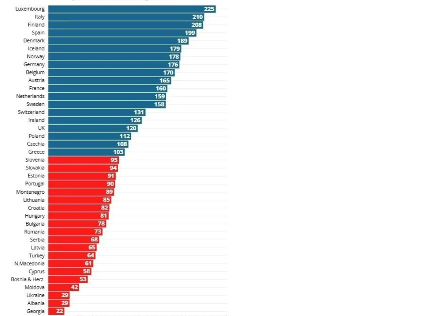 S druge strane, na dnu se nalaze Gruzija (22%), Albanija (29%) i Ukrajina (29%), gdje mirovina ne pokriva ni trećinu onoga što je čovjeku potrebno za puko preživljavanje.