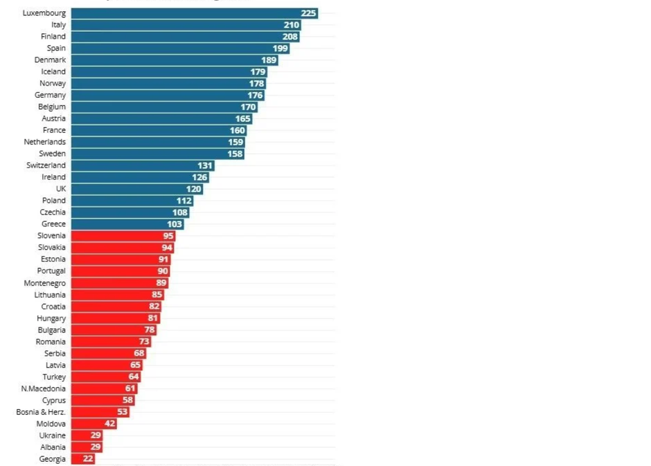 Istraživanje jasno pokazuje geografsku podjelu Europe. Na sjeveru i zapadu mirovine često dvostruko premašuju osnovne troškove. Apsolutni pobjednik je Luksemburg, gdje mirovina pokriva nevjerojatnih 225% životnih troškova, ostavljajući umirovljenicima višak od gotovo 16.000 eura godišnje. Slijede Italija (210%) i Finska (208%).