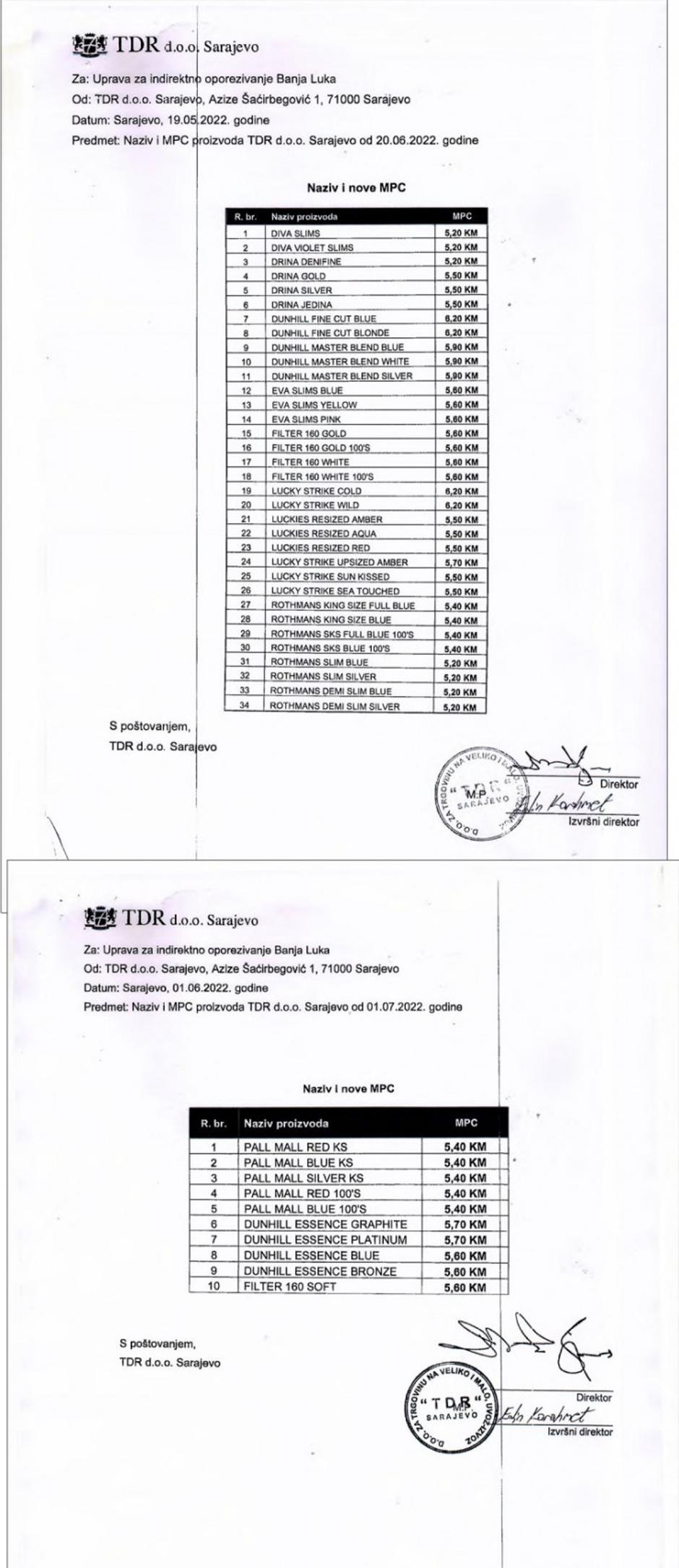 Poslovnica TDR-a u Sarajevu dostavila je UNO BiH nove maloprodajne cijene za 34 vrste cigareta koje će biti u primjeni od 20. lipnja.