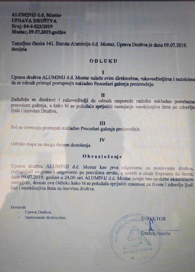 Direktor mostarskog Aluminija Dražen Pandža potpisao je ranije odluku o proceduri gašenja proizvodnje, a odmah iza ponoćio došlo je do gašenja hercegovačkog giganta.