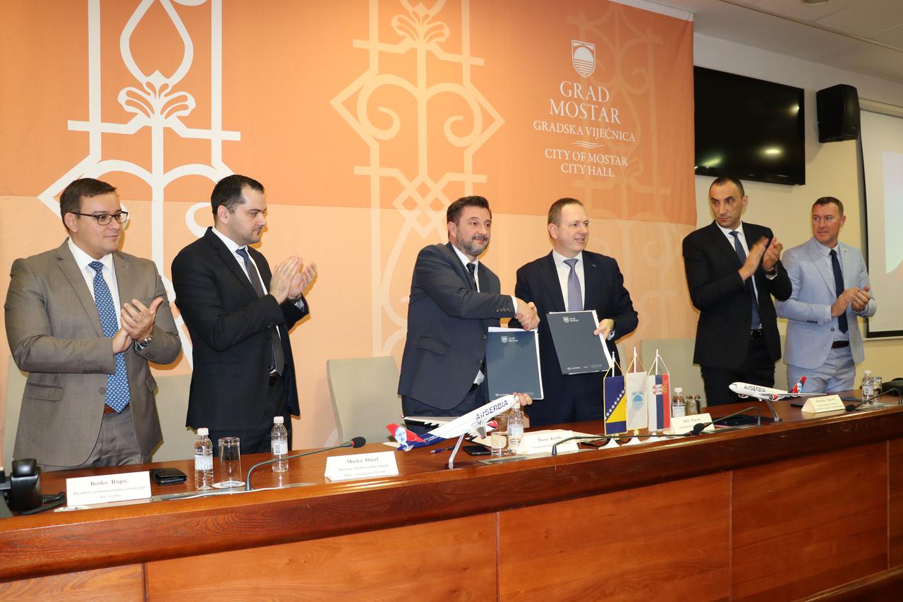 Ugovor između Grada Mostara, kompanije Air Serbia i Zračne luke Mostar potpisan je danas u Gradskoj vijećnici. Prvi let na relaciji Mostar - Beograd bit će 15. travnja, uoči Međunarodnog sajma gospodarstva, karte su od danas u prodaji, a početna cijena je 56 eura po smjeru, odnosno od 104 eura za povratno putovanje u ekonomskoj klasi.