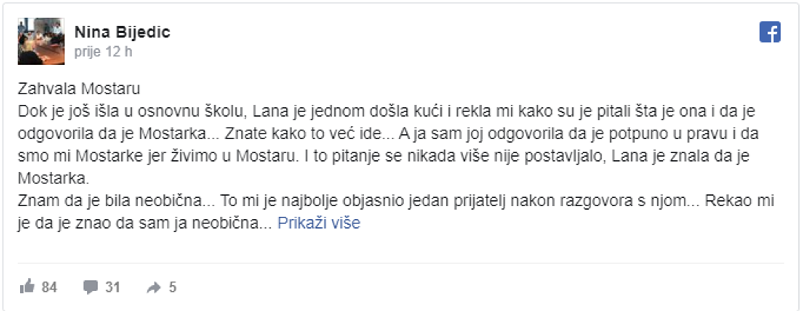 U ovom dirljivom statusu ona govori o svojoj Lani, njihovu odnosu, Mostaru, prijateljstvu...
