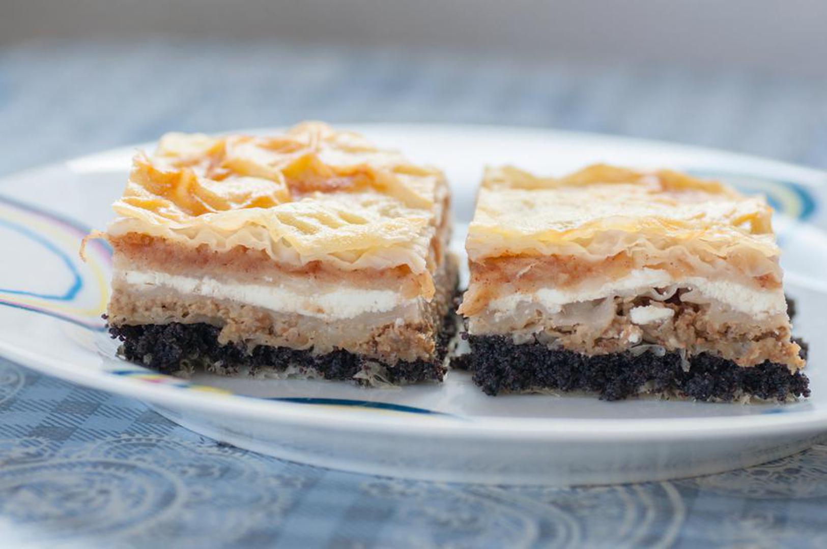 Na dno lima za pečenje stavite dvije kore za savijače (svaku premažite s malo rastopljenog maslaca). Na donju koru ravnomjerno rasporedite nadjev od oraha pa preko njega stavite dvije kore koje ćete svaku opet premazati maslacem. Zatim slijedi nadjev od sira, zatim maka i na kraju nadjev od jabuka.