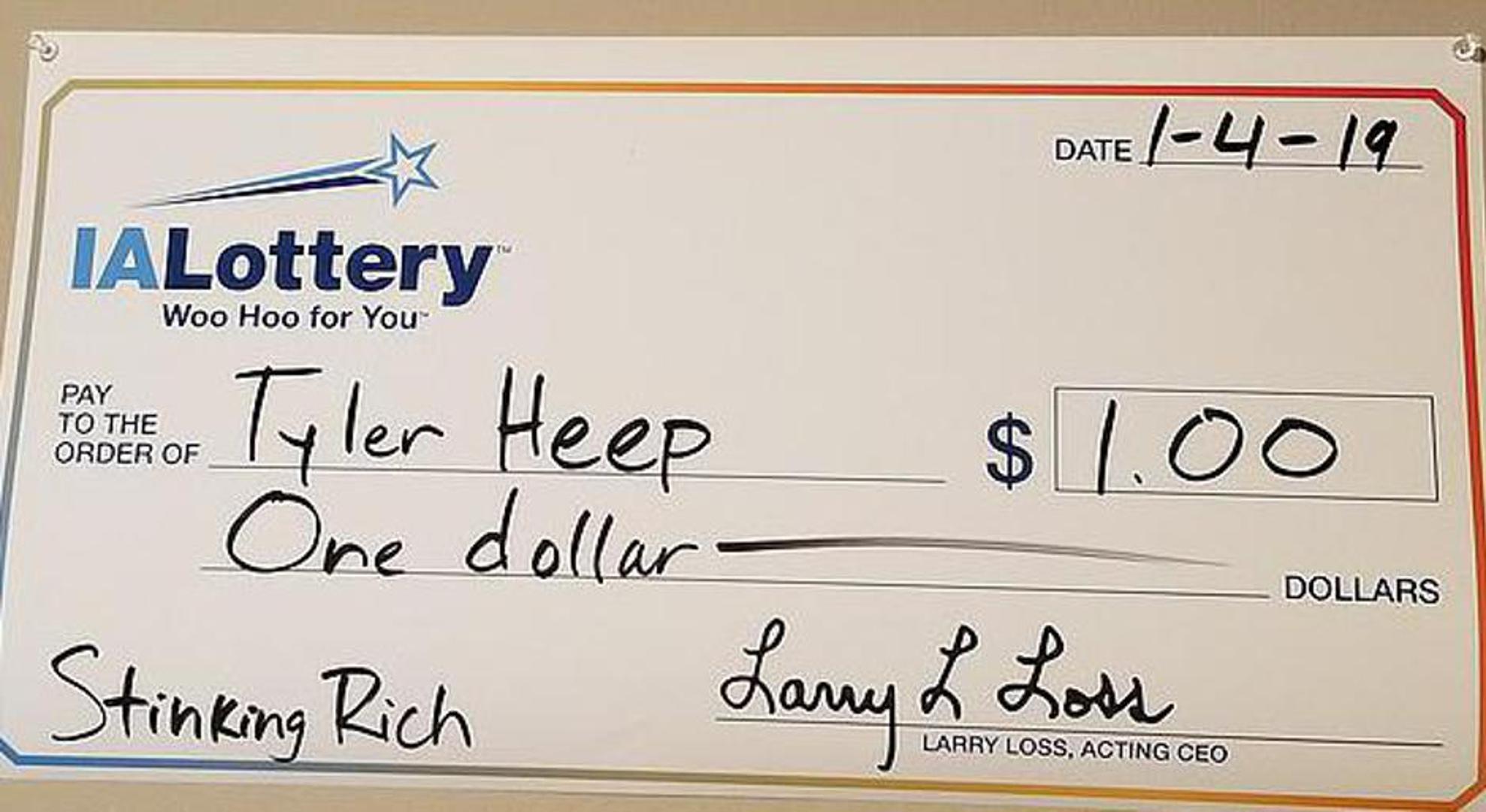 Tyler Heep osvojio je samo jedan dolar na "strugalici", ali dobitak je dobitak pa se pobrinuo da za to znaju baš svi! Naime, otišao je do sjedišta lutrije u obližnjem Des Moines i zatražio da mu dobitak ispišu na ogromnom čeku, upravo onako kako rade s dobitnicima koji osvoje jackpot.