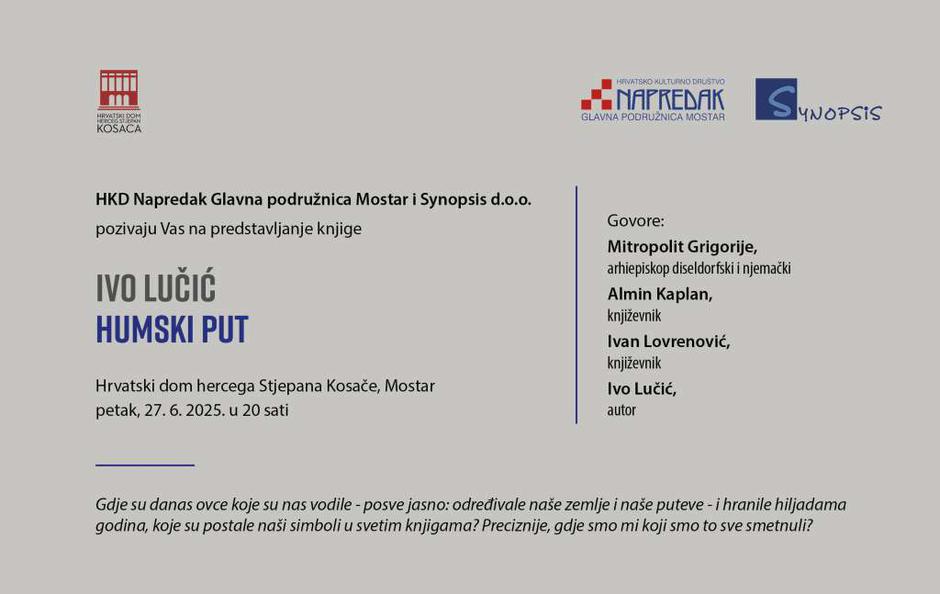 U organizaciji Hrvatskog kulturnog društva (HKD) Napredak Glavne podružnice Mostar, u petak, 27. lipnja, s početkom u 20 sati, u Hrvatskom domu hercega Stjepana Kosače u Mostaru bit će upriličeno predstavljanje knjige Ive Lučića pod nazivom ''Humski put'', objavljene 2024. godine u izdanju izdavačke kuće Synopsis d.o.o. Zagreb/Sarajevo i HKD-a Napredak.