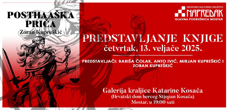 Predstavljanje knjige "Posthaaška priča“ autora Zorana Kupreškića bit će upriličena u četvrtak, 13. veljače 2025. u organizaciji HKD Napredak Glavna podružnica Mostar u Hrvatskom domu hercega Stjepana Kosače u Galeriji kraljice Katarine Kosača s početkom u 19 sati. Uz autora knjigu će predstaviti Bariša Čolak, Anto Ivić i Mirjan Kupreškić.