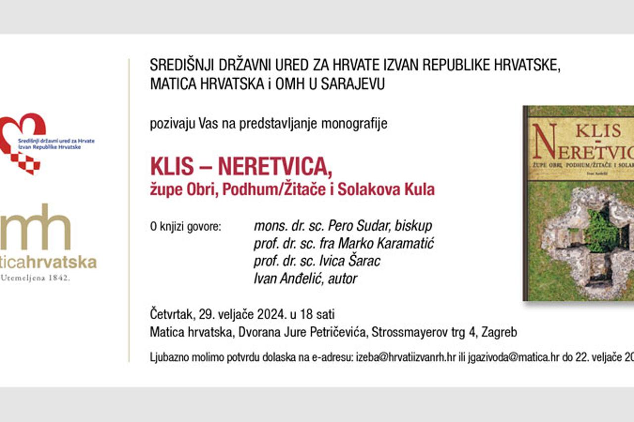 U četvrtak, 29. veljače 2024. u Dvorani Jure Petričevića (Strossmayerov trg 4) u Zagrebu, u organizaciji Središnjeg državnog ureda za Hrvate izvan Republike Hrvatske i Matice Hrvatske u Zagreb, s početkom u 18:00 sati, bit će predstavljena knjiga autora Ivana Anđelića pod naslovom „Klis – Neretica, župe Obri, Podhum/Žitače i Solakova Kula“.