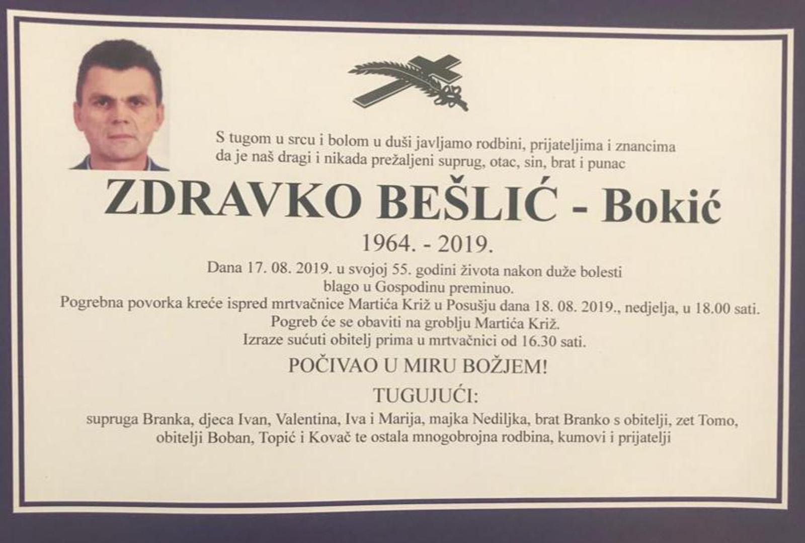 Nakon duže bolesti, u subotu, 17. kolovoza u Posušju je, u 55. godini života, preminuo Zdravko Bešlić – Bokić, izaslanik u Domu naroda Parlamenta FBiH iz reda Hrvata i zastupnik u Skupštini ŽZH.