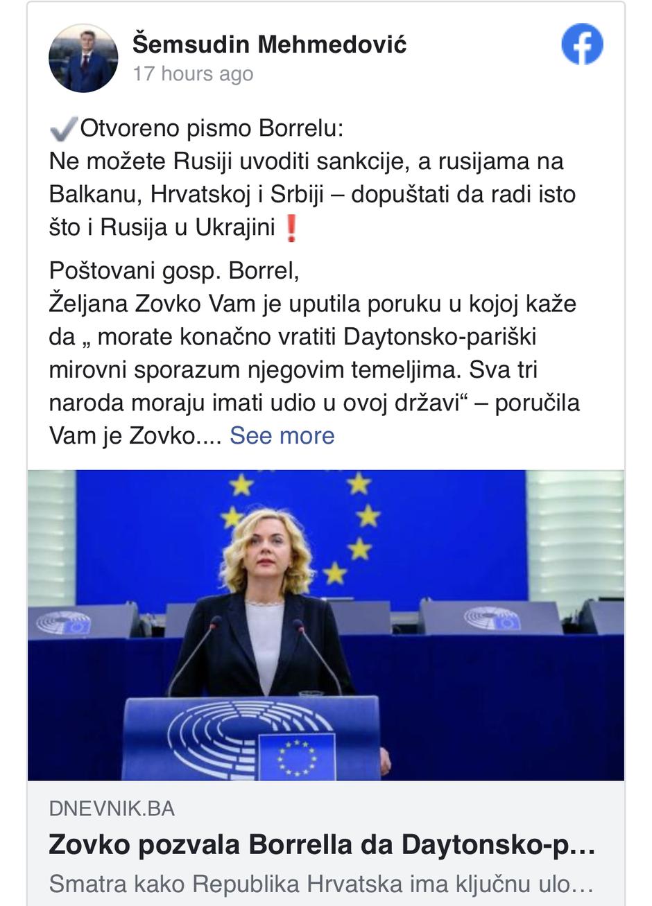 Na svome Facebook profilu uz pismo koje je navodno poslao Borellu s fotografijom nastupa Zovko u Europskome parlamentu. Vlasti BiH do sada nisu reagirale na česte ispade radikala Mehmedovića koji širi govor mržnje i upućuje prijetnje ‘neprijateljima Bosne’.